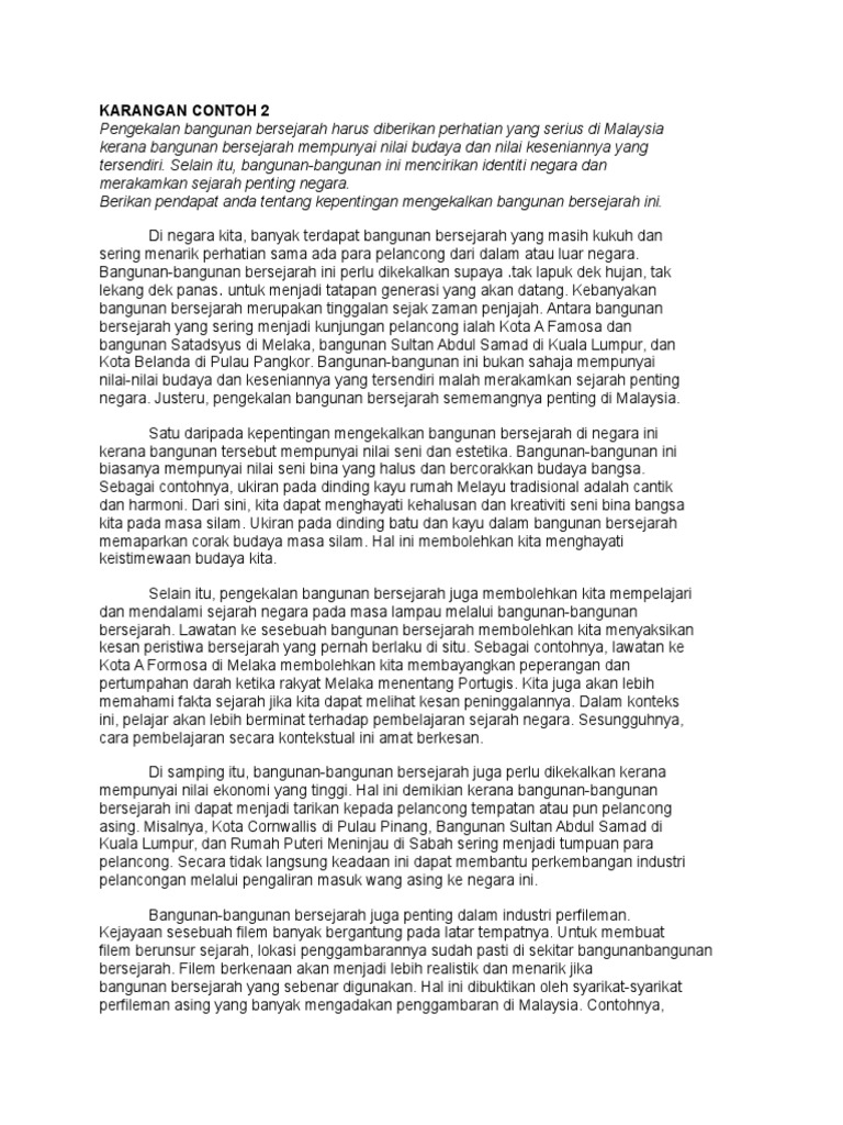 Karangan Bangunan Bersejarah Perkongsian kali ini melibatkan karangan yang iaitu Karangan Bangunan Bersejarah Contoh Karangan Bangunan Bersejarah Assalamualaikum dan selamat sejahtera Tuan Yang Dipertua rakan-rakan Yang Berhormat daripada pihak kerajaan barisan pembangkang dan seterusnya ahli-ahli dewan sekalian. KEPENTINGAN MEMELIHARA BANGUNAN BERSEJARAH. Berikan pendapat anda tentang pernyataan di atas.